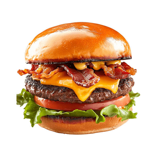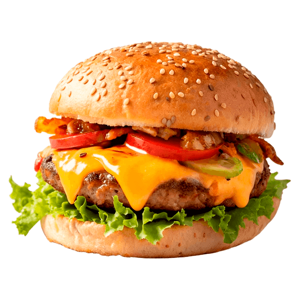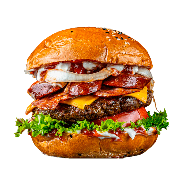 € 8 (Pan/lechuga/tomate/carne/salsa bbq/queso chedar/tocino/papas fritas, onion rings)