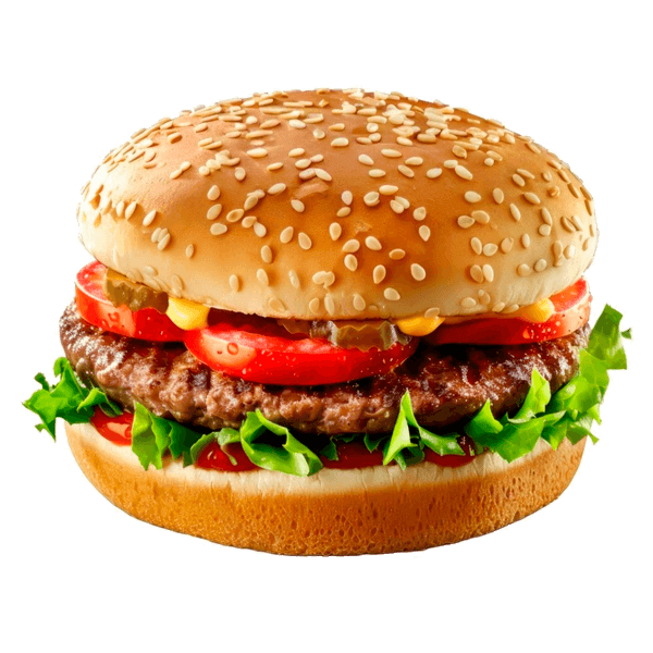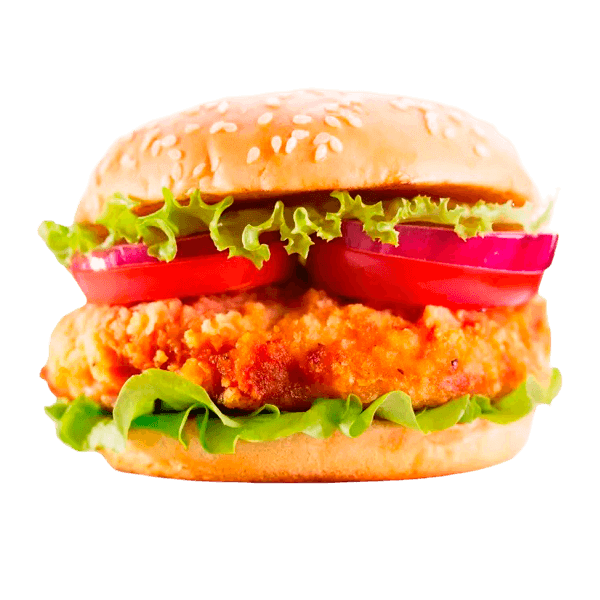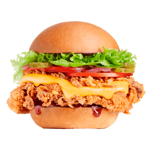€ 7 (Pan/lechuga/tomate/filete de pollo crispy/queso chedar/queso edam/papas fritas/onion rings)