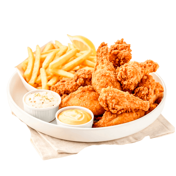 € 12 (Alas de pollo broaster/papas fritas/coleslaw/limón y pimienta/especies)